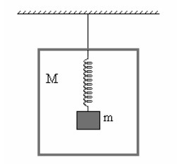 Коробка массой M подвешена на нитке к потолку комнаты. Внутри коробки на пружине подвешен груз массой m. Нитку пережигают. С каким ускорением относительно коробки начнёт двигаться груз?