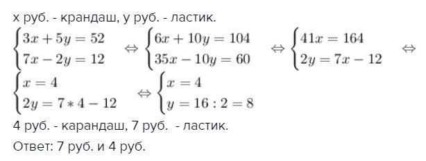 За 3 карандаша и 5 ластиков заплатили 52 рубля. Найдите цену ластика и ценку карандаша, если 7 карандашей дороже 2 ластиков на 12 рублей