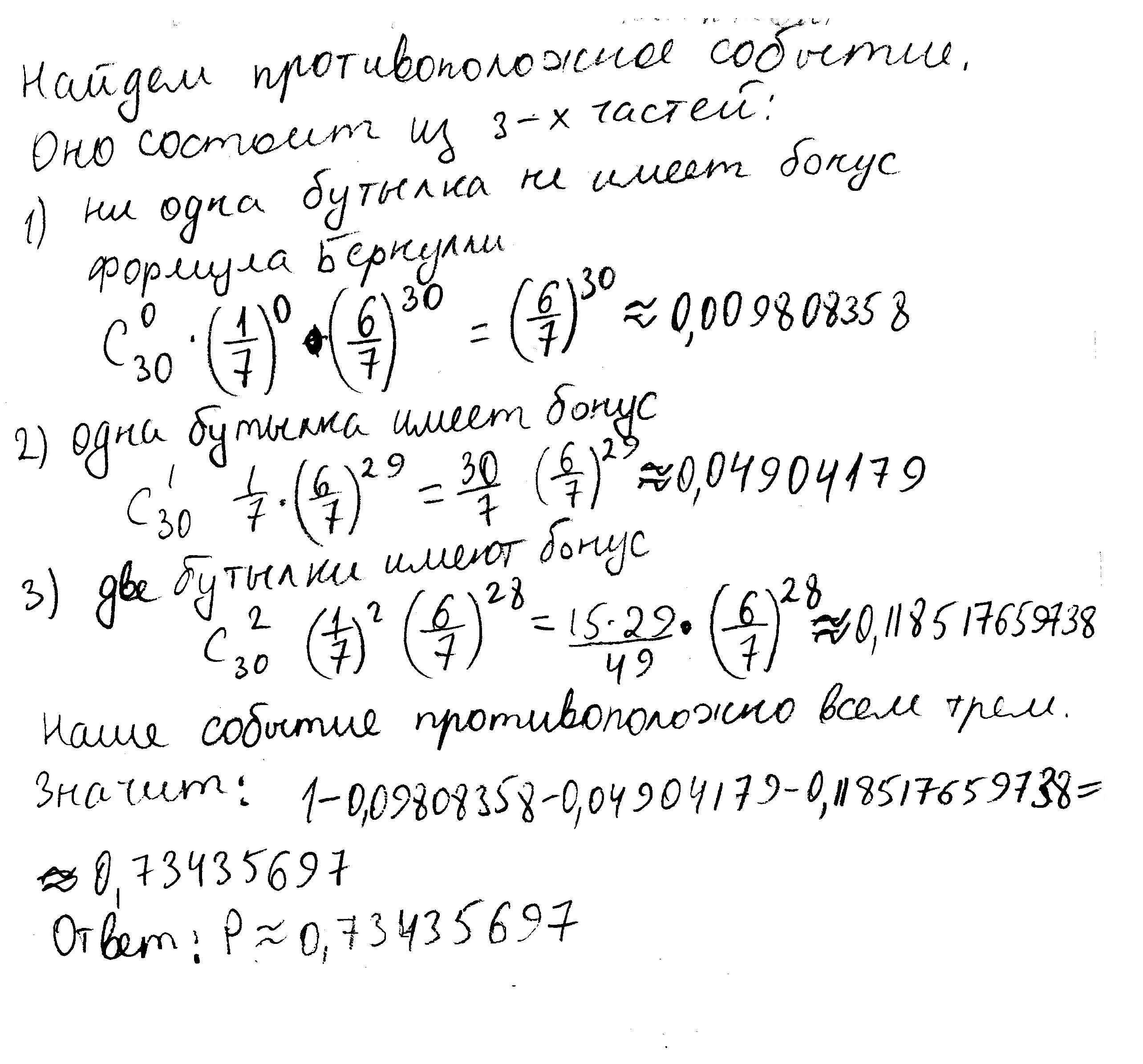 Во время проведения акции известно, что, в среднем, у каждой седьмой бутылки кока-колы под крышкой есть бонус. Для вечеринки купили 30 бутылок. Какова вероятность, что у хотя бы трех бутылок будет бонус?