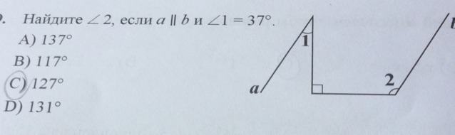 угол перпендикуляра = 90 => угол 2 = 90+37=127