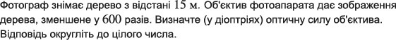 задача из темы "Оптика" Перевод: фотограф снимает дерево из расстояния 15 м. Объектив фотоаппарата дает уменьшения в 600 раз. Определите оптическую силу объектива.