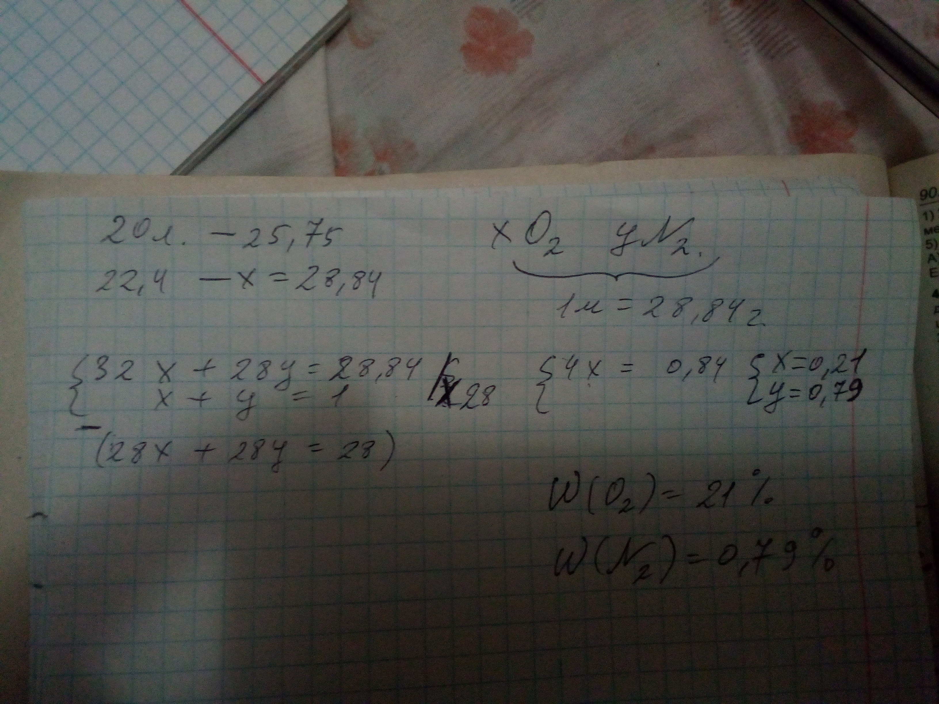 При нормальных условиях 20 л смеси кислорода и азота имеют массу 25,75 г. Вычислите массовые доли газов в смеси.