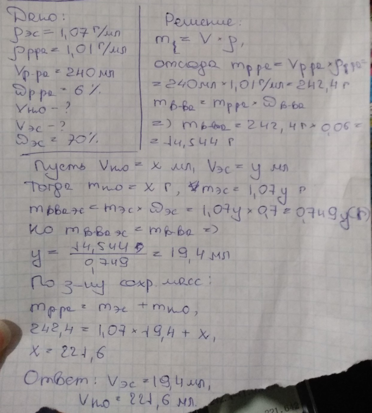 какие объёмы воды и уксусной эссенции(70%) необходимо для приготовления 240 мл 6% раствора?