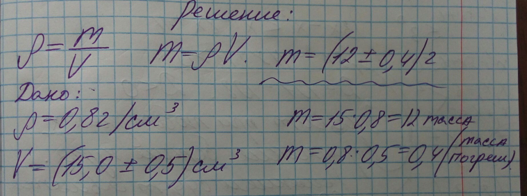 Я считаю , нужно объем умножить на плотность. т.е 15 * 0,8 = 12 грамм , с погрешностью 0,36 . ( т.к 0,5 это 3,3% от 15, поэтому находим 3,3% от полученной массы , получается 0,36)