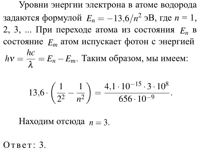 Электрон в атоме водорода переходит на вторую стационарную орбиту, испуская волны, длина которых равна 656 нм. С какой стационарной орбиты переходит этот электрон? Скорость света принять равной 3·108 м/с, а постоянную Планка — 4,1·10−15 эВ·с.