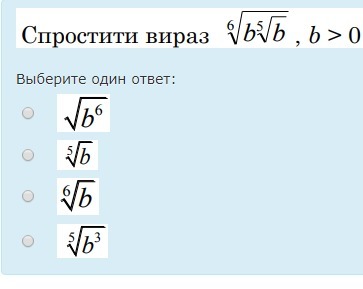⁶√(b⁵√b) = ⁶√⁵√(b*b⁵) = ⁶ˣ⁵√(b⁶) = ⁵√b - ответ второй сверху