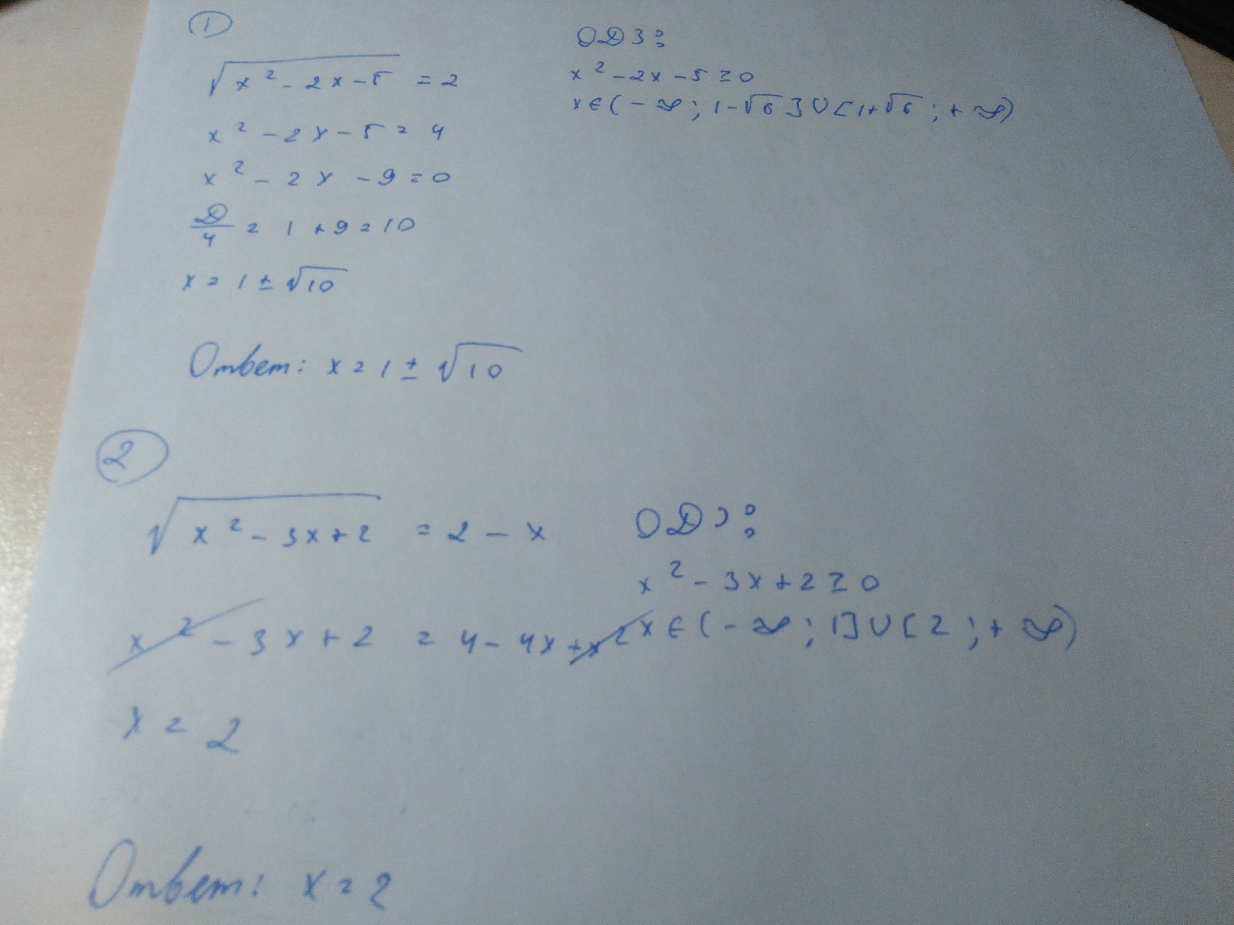 √ все под корнем х^2-2х-5=2 найдите корень уравнения , √ х^2-3х+2=2-х , √ х^3-4=11 найдите корень уравнения, √ х^2-9=4 найдите корень .