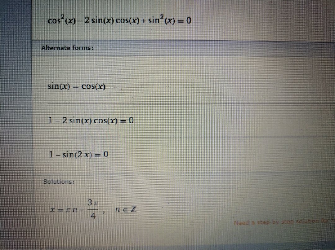 1) cos²(x)-2sin(x)*cos(x)+sin²(x)=0