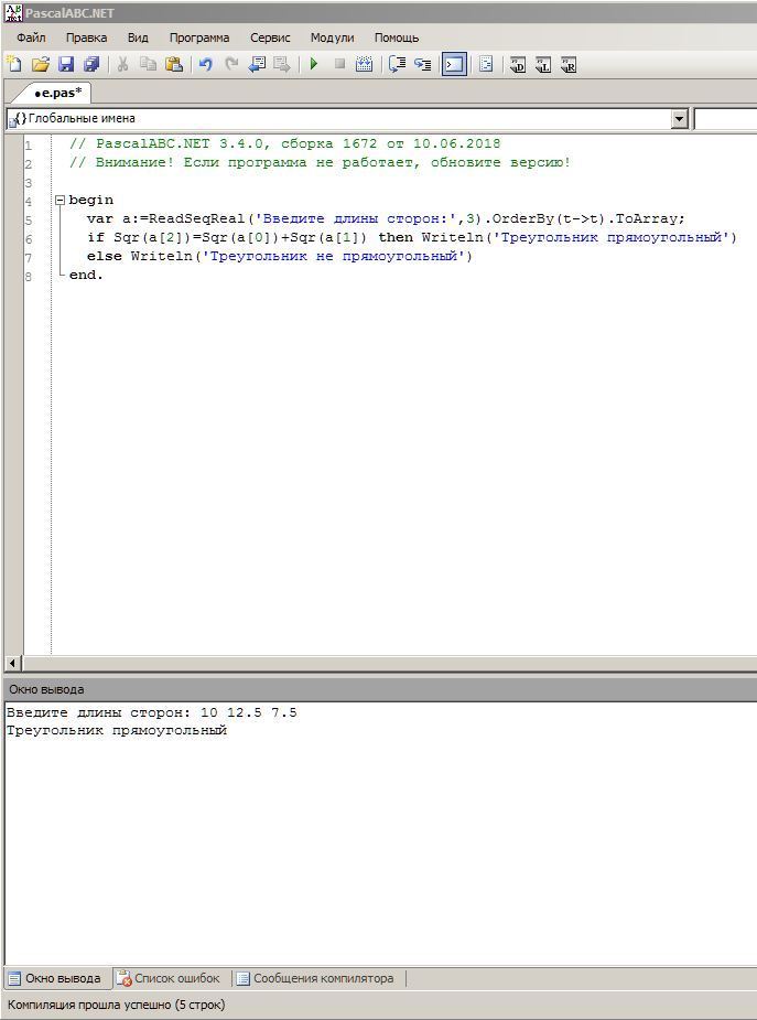 if Sqr(a[2])=Sqr(a[0])+Sqr(a[1]) then Writeln('Треугольник прямоугольный')