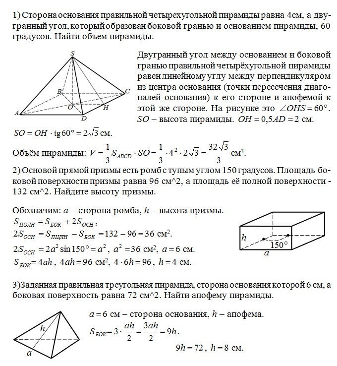 1) Сторона основания правильной четырехугольной пирамиды равна 4см, а двугранный угол, который образован боковой гранью и основанием пирамиды, 60 градусов. Найти объем пирамиды.