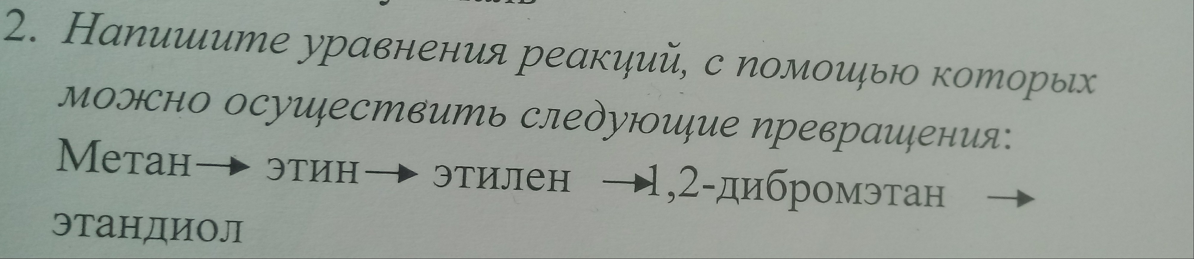 Метан → этин (ацетилен) → этилен → 1,2 дибромэтан → этандиол (этиленгликоль)