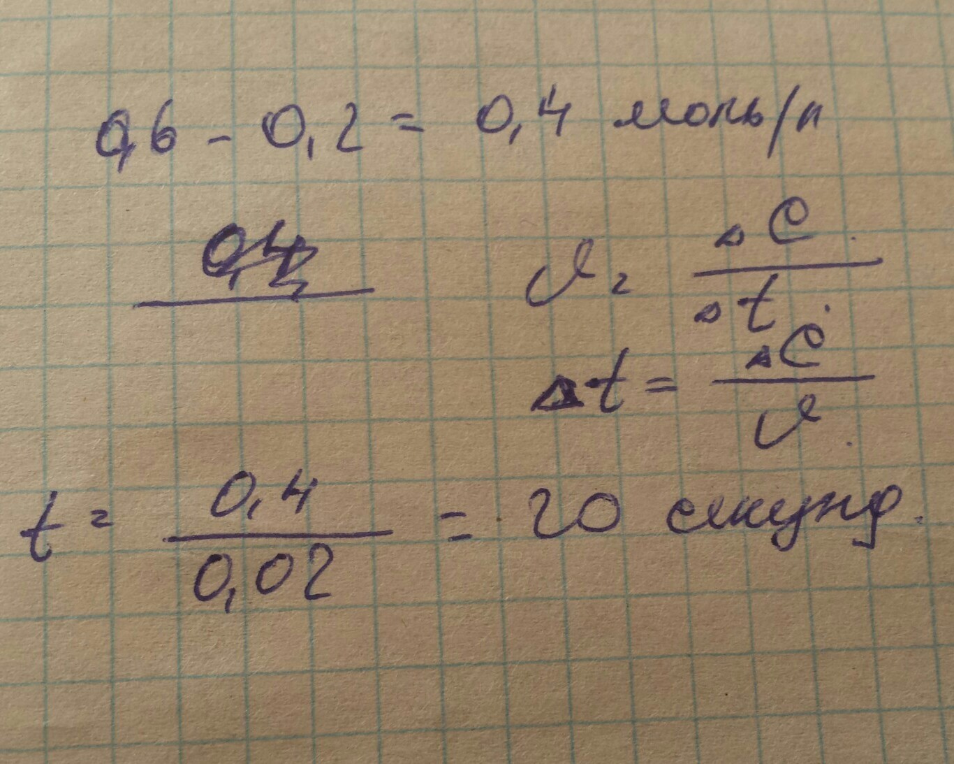 Скорость реакции A + B -> AB равна 0,02 моль/л•сек . Исходная концентрация вещества А была равна 0,6 моль/л . Через сколько секунд его концентрация станет 0,2 моль/л ?