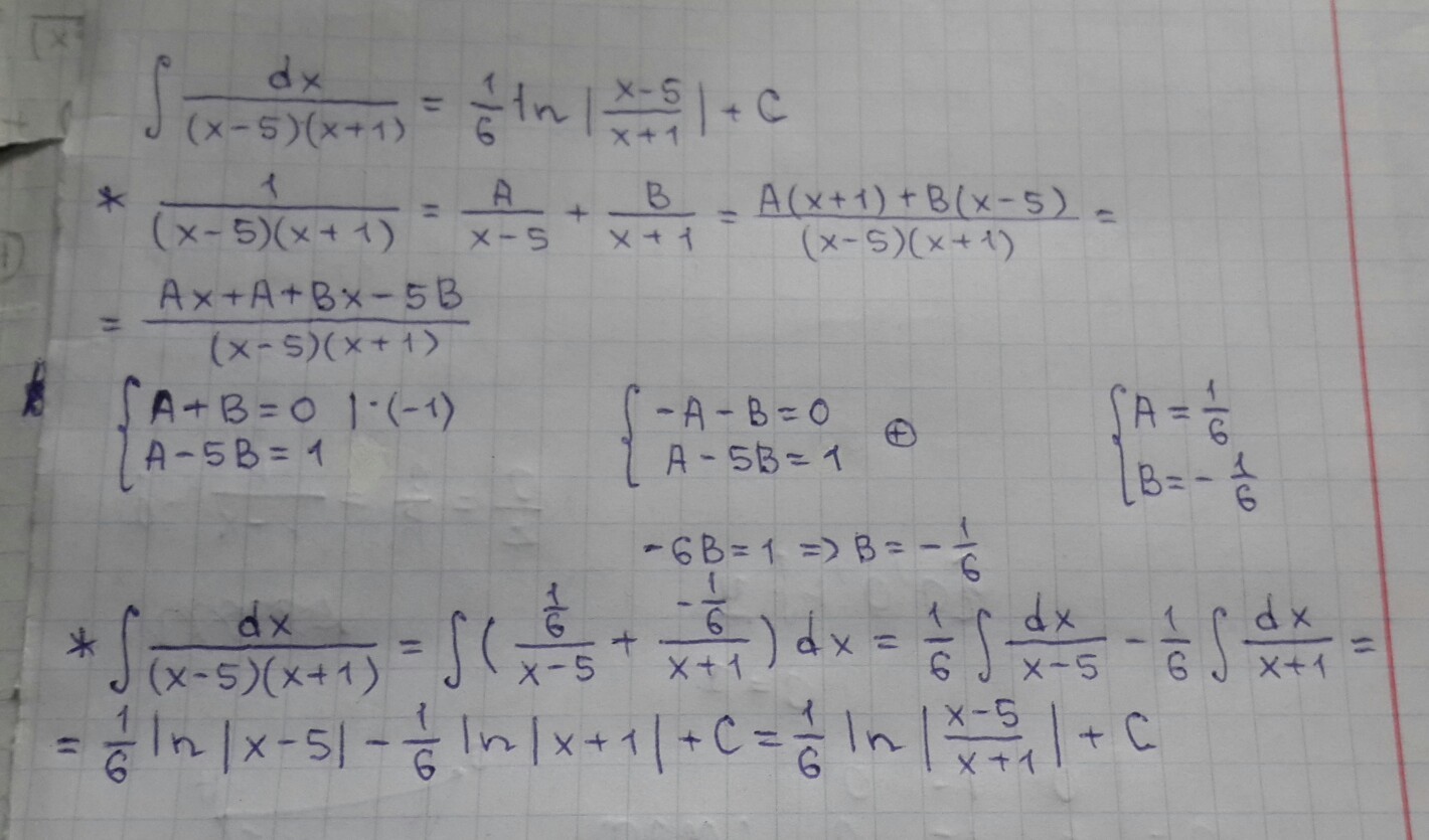 Используя метод неопределенных коэффициентов,найти неопределенный интеграл: интеграл dx/(x-5)(x+1)