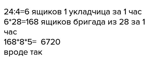 240*28=6720 ящ 28 укладчиц за 5 рабочих дней
