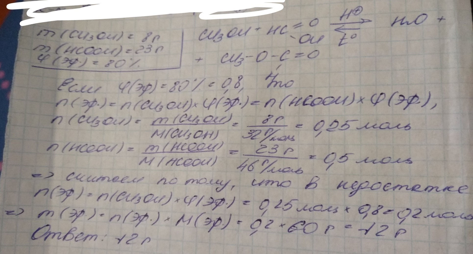 При взаимодействии 8 г метанола и 23 г муравьиной кислоты получили сложный эфир. Определите массу эфира, если выход составляет 80% от теоретически возможного.