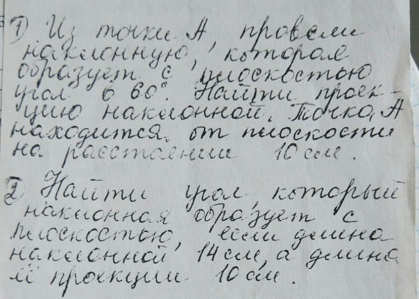 2.косинус кута між проекцією і похилою= проекція/похила=10/14=5/7