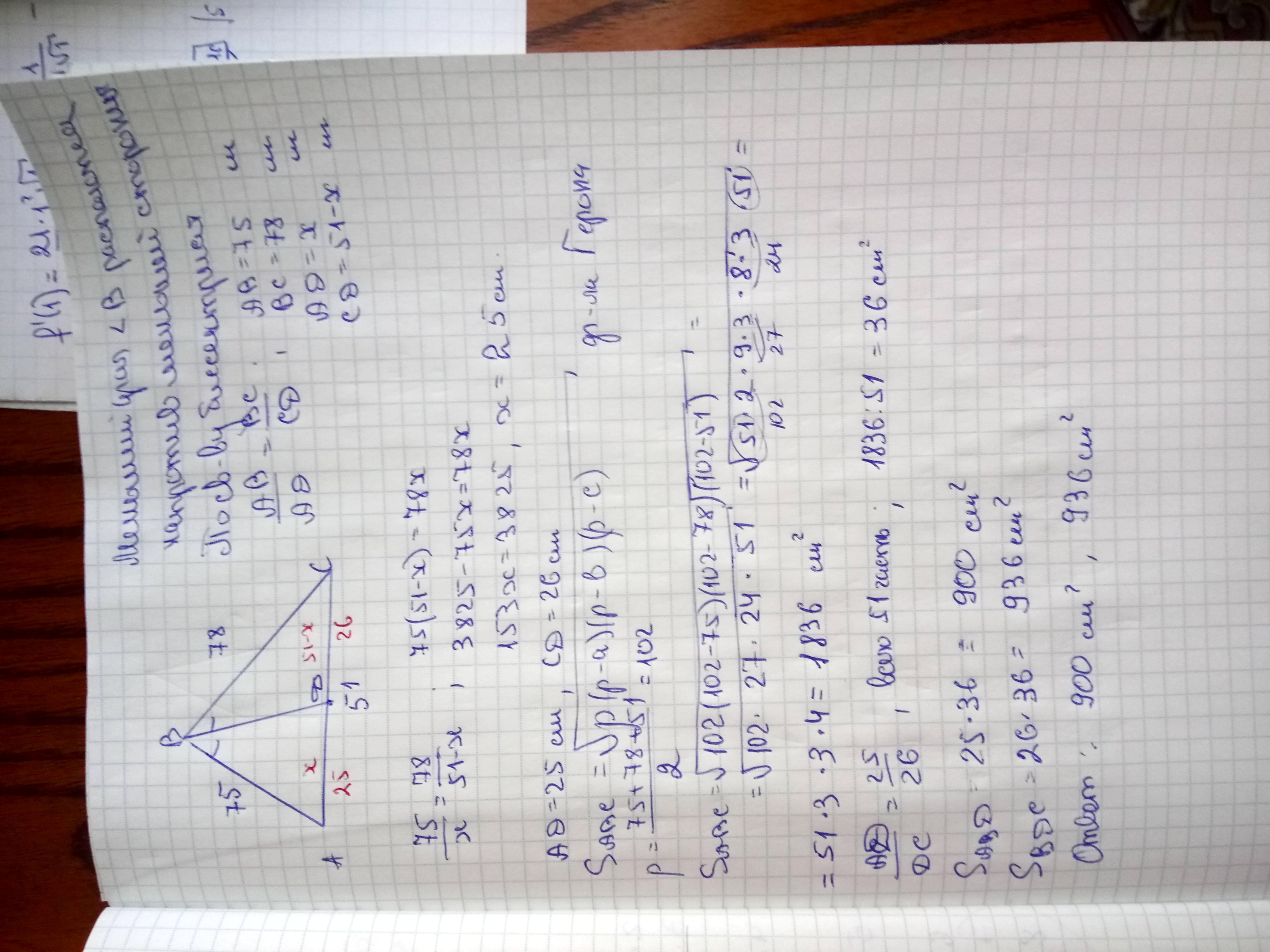 Решение правильное, нашли площадь =1836. Но вторую часть лучше делать покороче - по св-ву биссектрисы т.к. сторонA делится пропорционально, то и площади тоже находятся пропорционально, т.е. S1= 1836/(75+78) * 75=900 и S2=1836-900=936