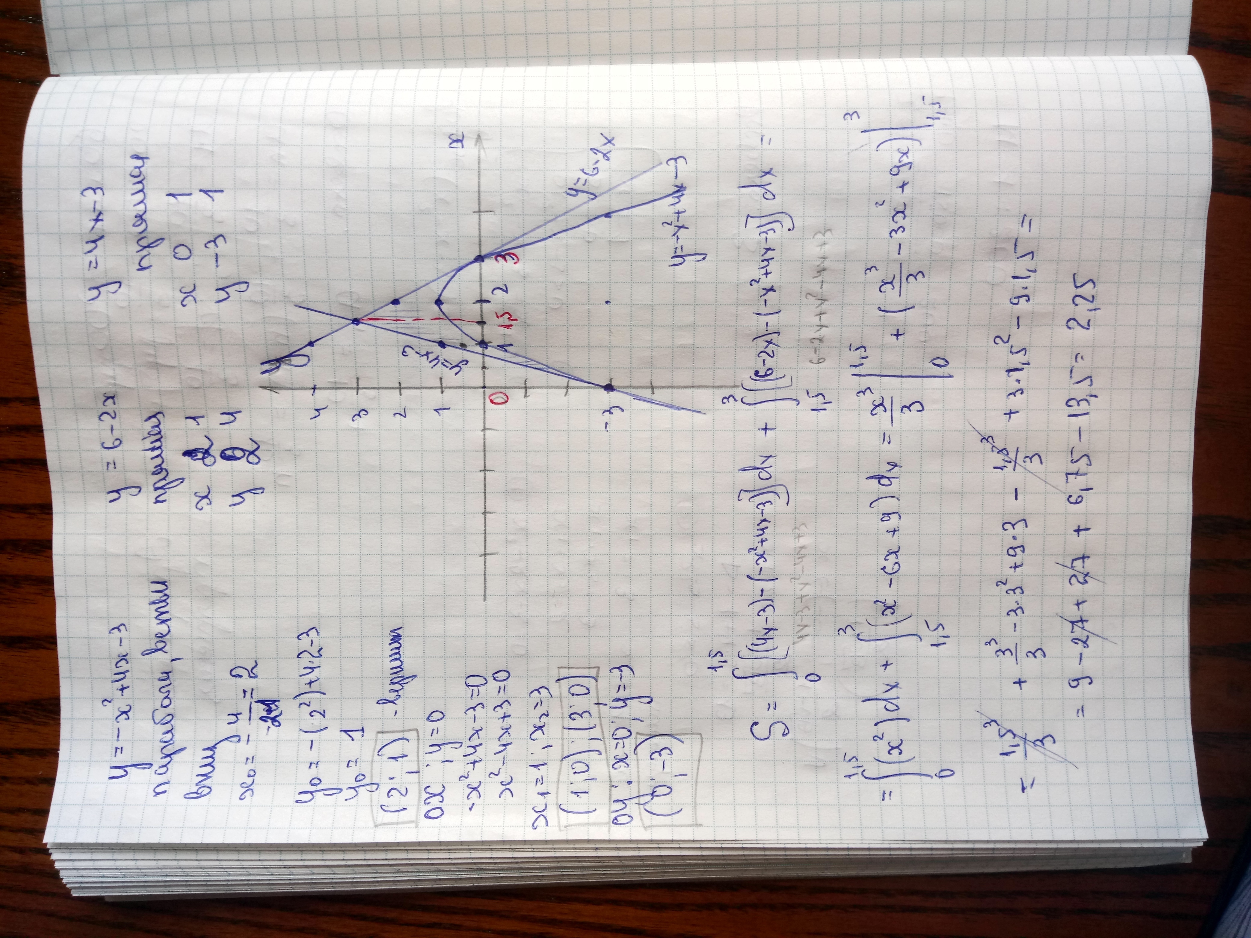 построить фигуру ограниченную линиями и найти ее площадь y=-x^2+4x-3, y=6-2x, y=4x-3 помогите пожалуйста