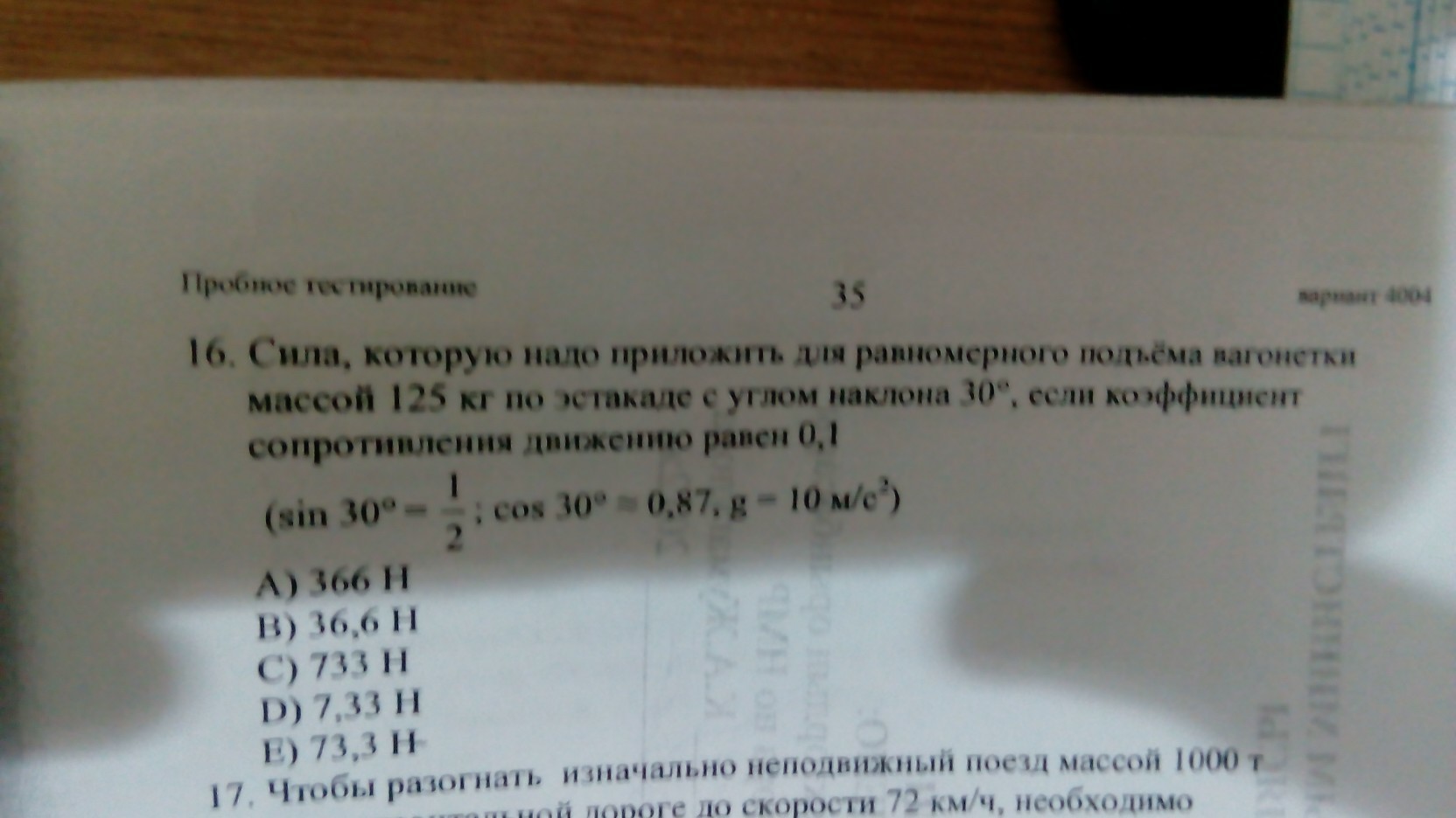 сила которую надо приложить для равномерного подъёма вагонетки массой 125 кг по эстакаде с углом наклона 30°, если коэффициент сопротивления движению равен 0,1