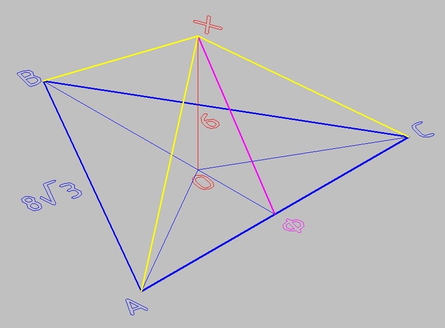 Высота правильной треугольной пирамиды равна 6 см. Сторона ее основания - 8√3. Вычислить длину ребра,площадь поверхности и объём пирамиды.