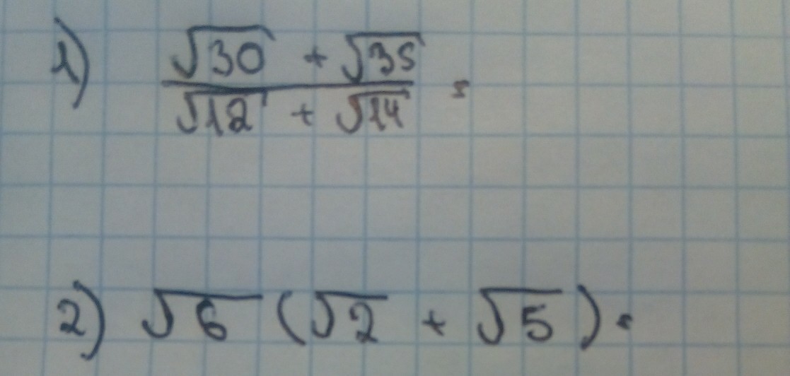 1) tex] frac{ sqrt{30}+sqrt{35} }{sqrt{12}+sqrt{14}} =frac{ sqrt{5}(sqrt{6}+sqrt{7} )}{ sqrt{2}(sqrt{6}+sqrt{7} )}=sqrt{frac{5}{2}}