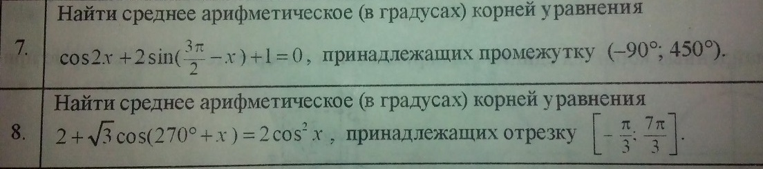 1);; cos2x+2sin(frac{3pi }{2}-x)+1=0\\cos2x-2cosx+1=0\\2cos^2x-1-2cosx+1=0\\2cosx(cosx-1)=0\\a); ; cosx=0; ,; x=frac{pi }{2}+pi n,; nin Z\\xin (-90^circ ,450^circ ):; ; x=90^circ ,; 270^circ , .\\b); ; cosx=1; ,; ; x=2pi k,; kin Z\\xin (-90^circ ,450^circ ):; ; x=0^circ ,; 360^circ , .\\c); ;  frac{90^circ +270^circ +0^circ +360^circ }{4}=frac{720^circ }{4}=180^circ ; ; -; otvet.