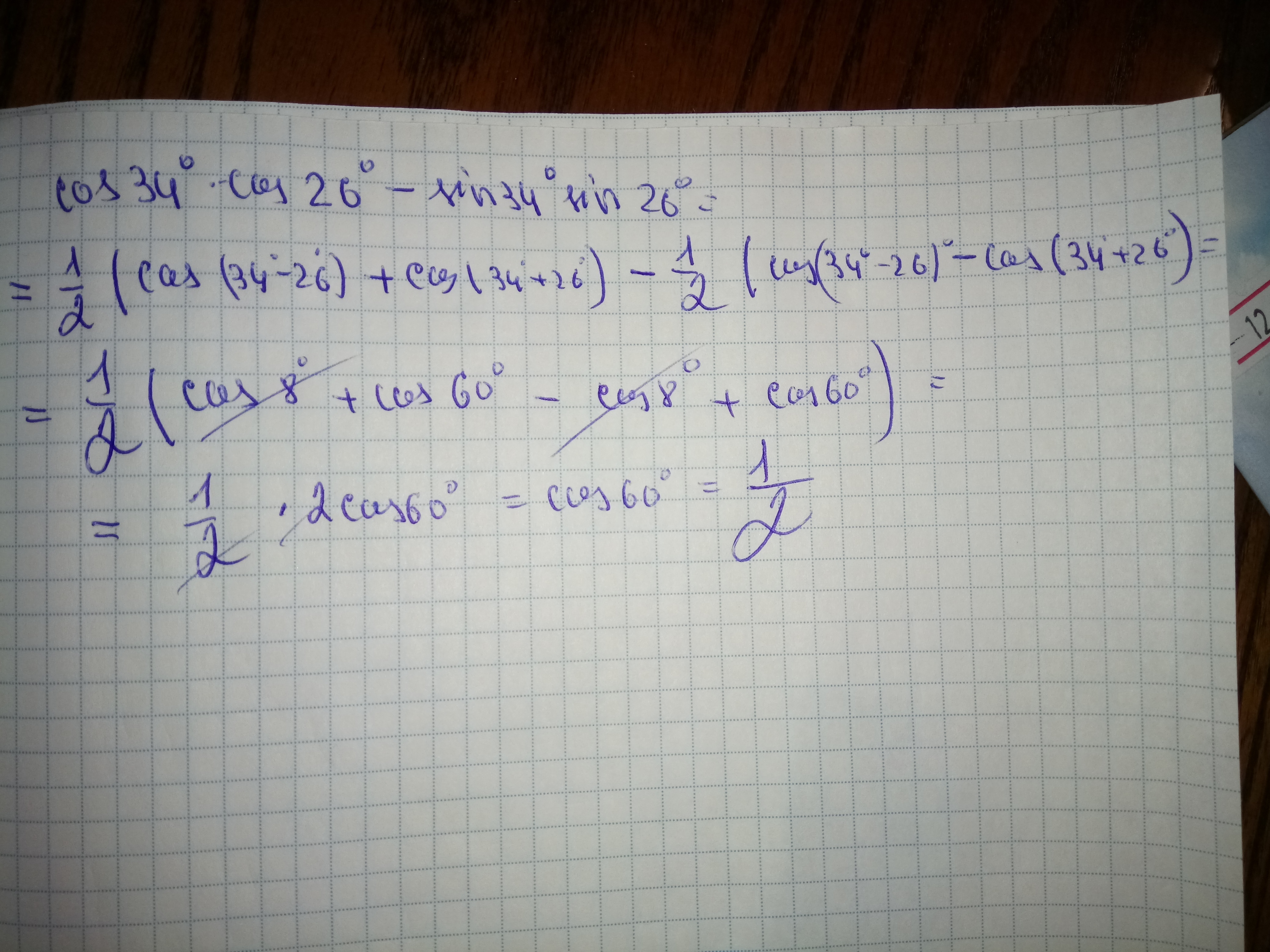косинус 34 градусов умножить на косинус 26 градусов минус синус 34 градусов умножить на синус 26 градусов