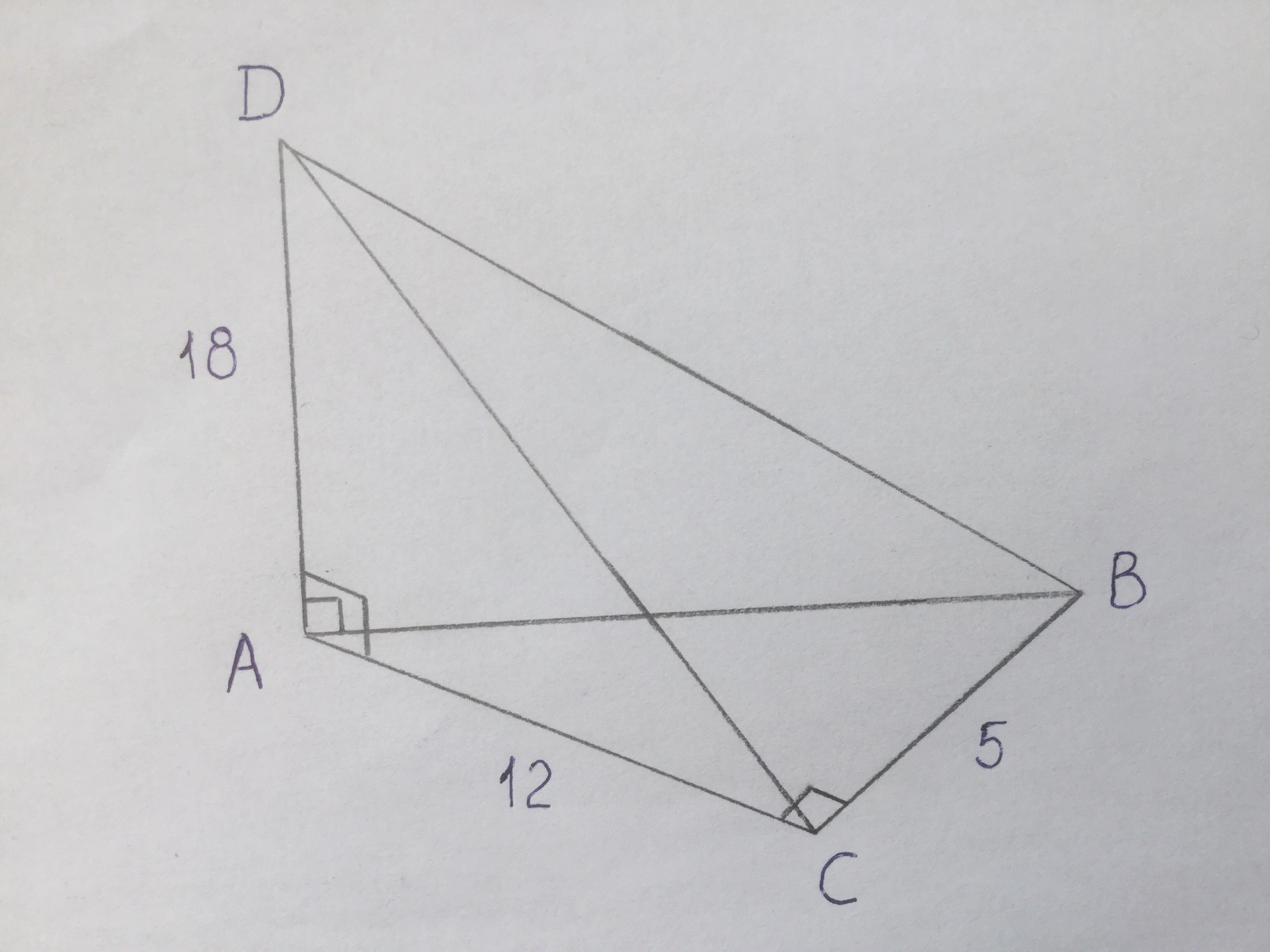 У трикутнику АВС (кут С = 90 гр.) АС = 12 см, ВС = 5 см.Через точку D поза площиною трикутника до цієї площини проведено перпендикуляр AD рівний 18 см. Знайти DB i DC.