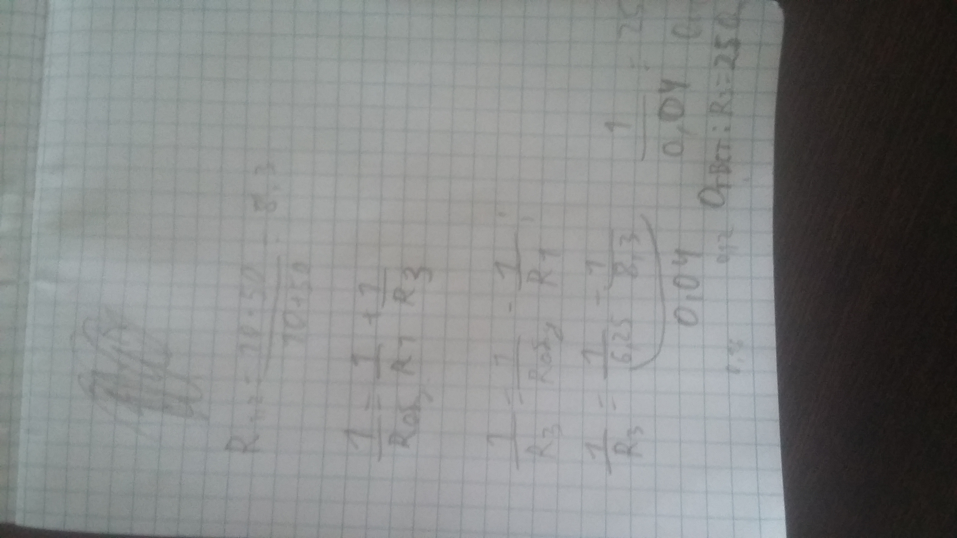 три проводника соединены параллельно. Два проводника имеют сопротивление 10 и 50 Ом .Определить сопротивление третьего проводника если общее сопротивление 6,25 ом