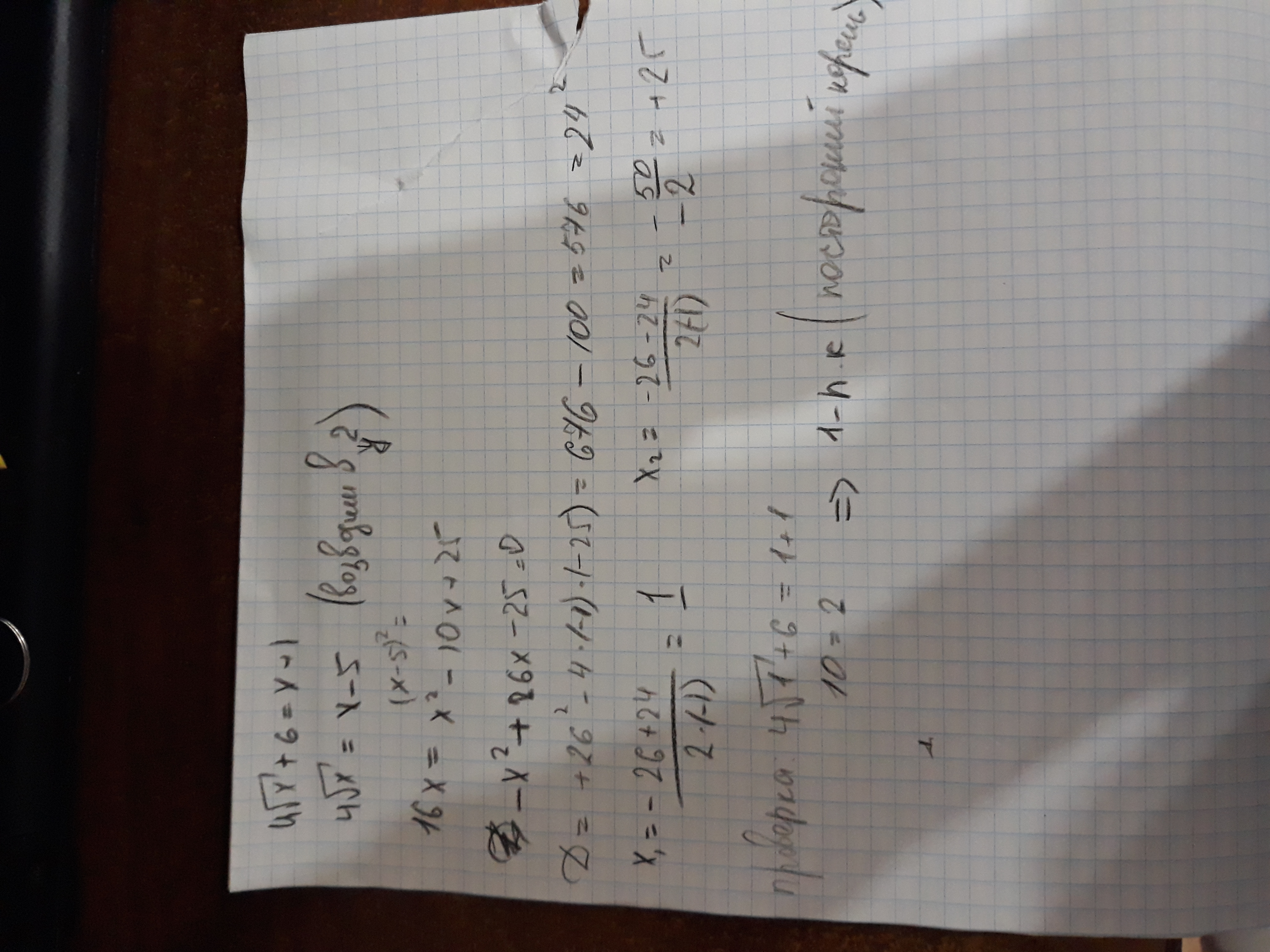 Дальше обычное квадратное уравнение, по теореме Виета: х1+х2=26;х1*х2=25. Следовательно корни будут 1 и 25, но методом проверки 1 не подходит, т. е. корень 25