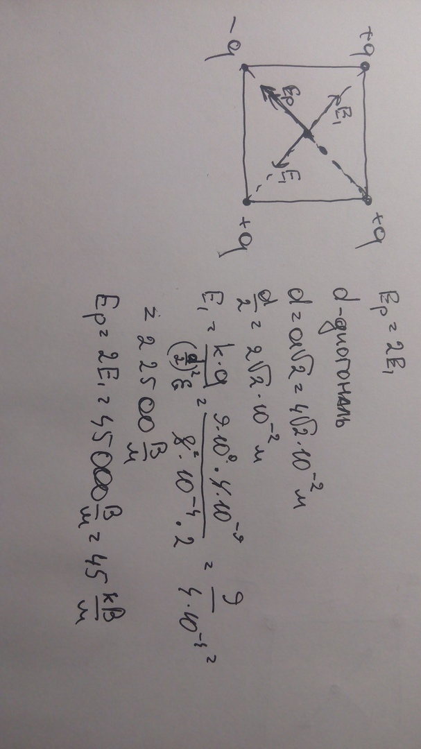 В трех вершинах квадрата со стороной 4 см находятся одинаковые положительные заряды величиной 4 нКл каждый, а в четвертой вершине закреплен отрицательный точечный заряд такой же величины. Определить модуль вектора напряженности электрического поля в точке пересечения диагоналей квадрата если заряды находятся в диэлектрике с проницаемостью равной 2