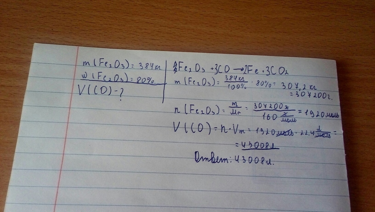 Определите объём (н.у) оксида углерода (II), который потребуется для восстановления оксида железа (III) массой 384 кг, содержащего 20% примесей.