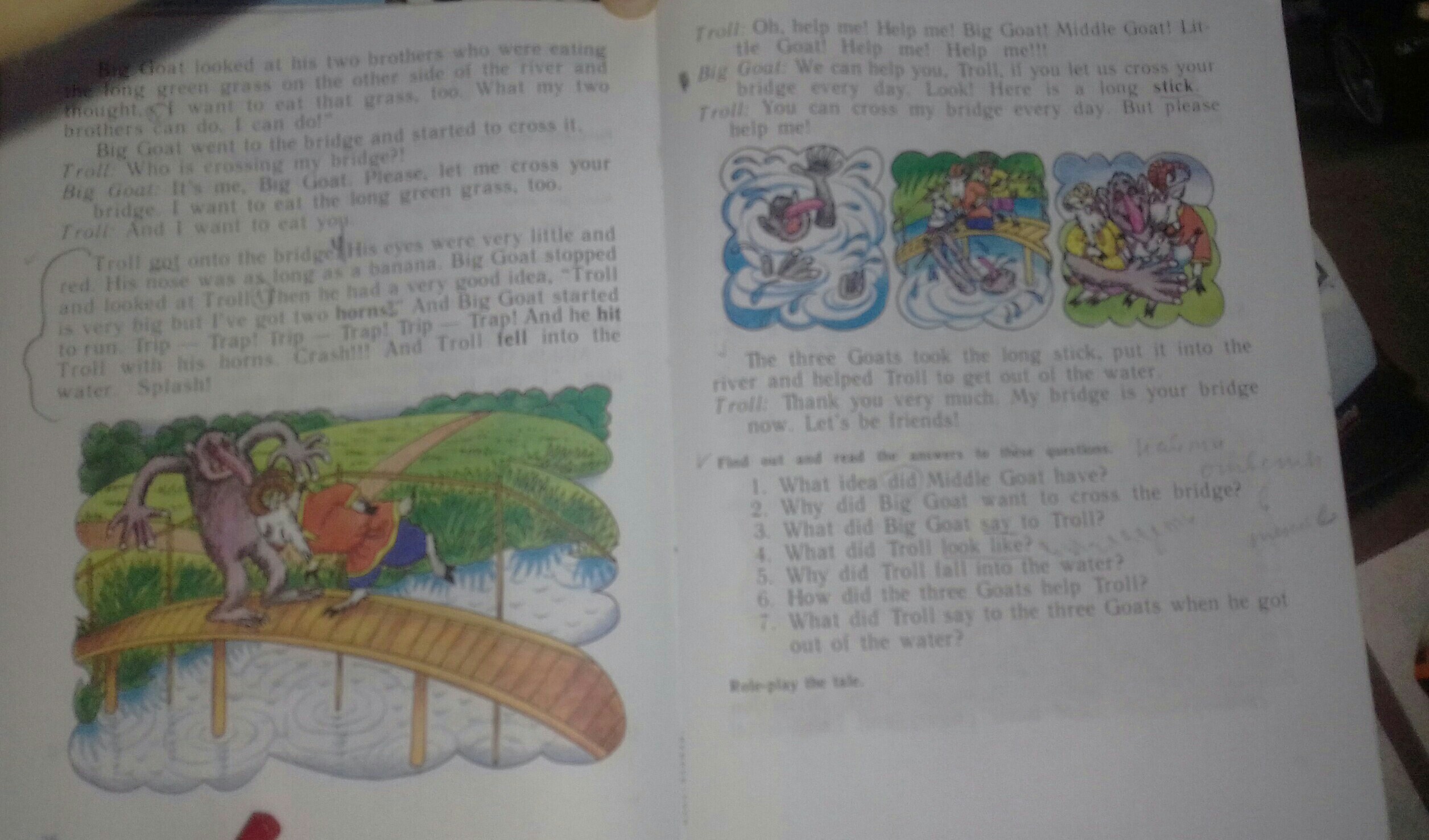 6. The three goats took a long stick (длинную палку), put it into the river and helped Troll to get out of the water.