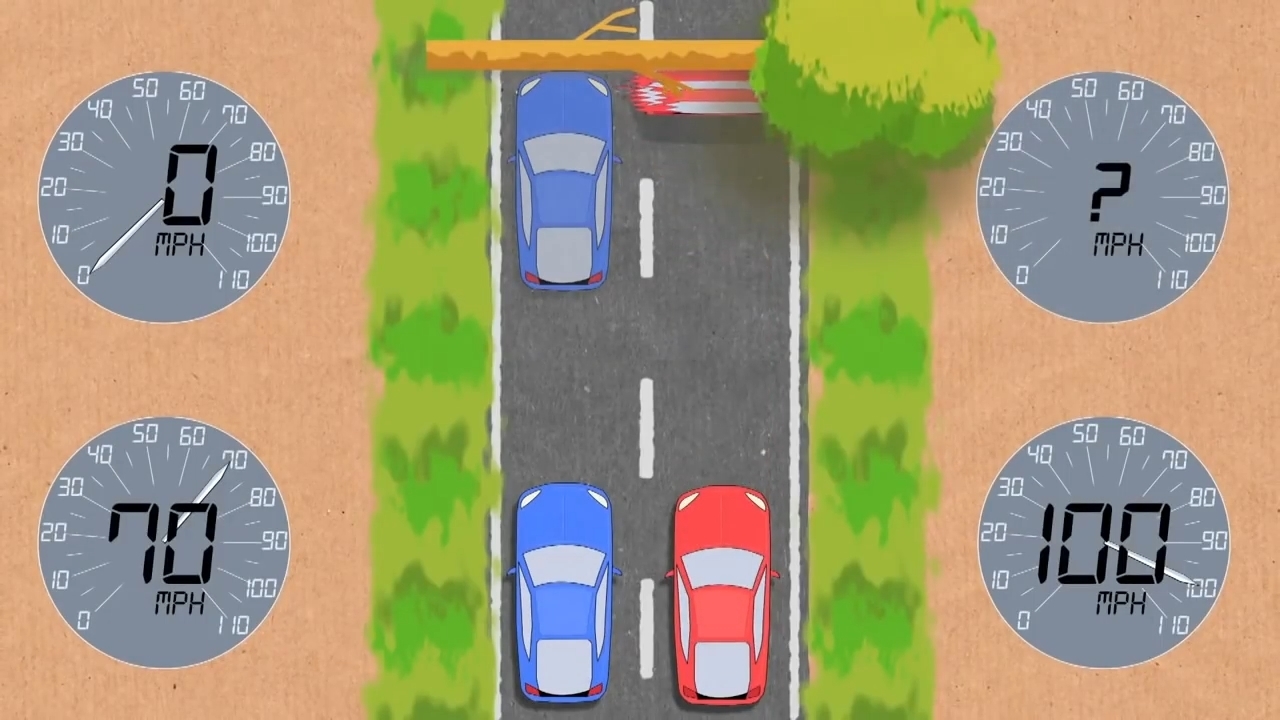 Когда эти машины выровнялись относительно дороги, перед ними неожиданно появляется препятствие. Синяя машина начинает тормозить и останавливает впритык к препятствию, но не врезается в него. С какой скоростью красная машина врежется в препятствие?