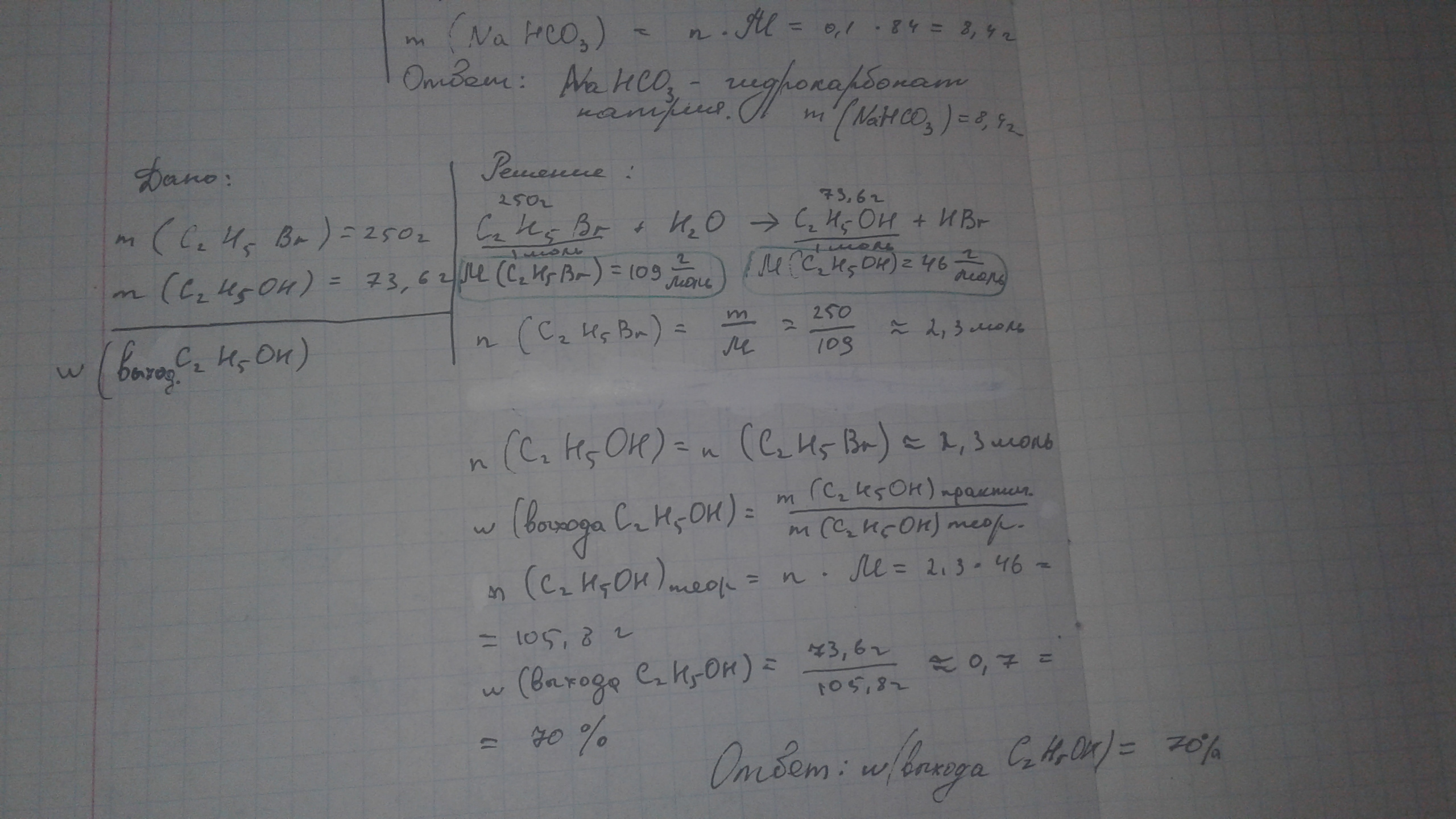 Найти массовую долю выхода этилового спирта, если при взаимодействии бромэтана массой 250г с водой образуется 73,6г этилового спирта.