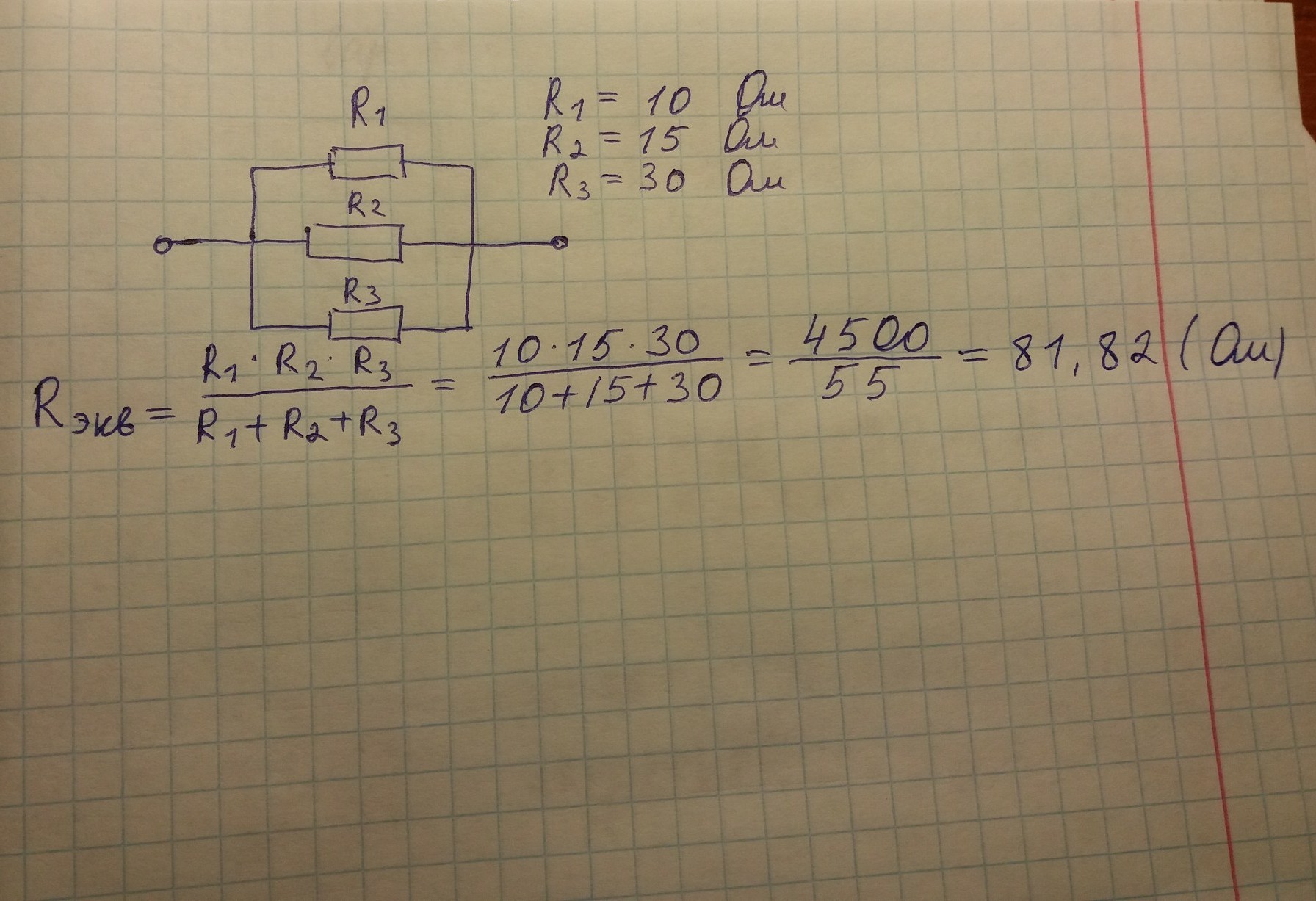 Три сопротивления 10 Ом, 15 Ом и 30 Ом соединены параллельно. Определить их эквивалентное сопротивление