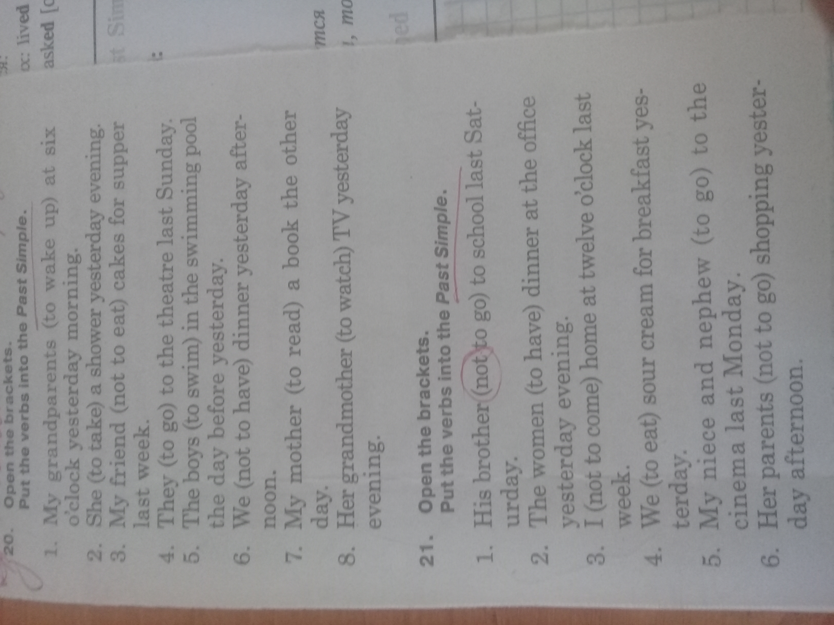 1.My grandparenta waked up at six (6) o`clock yesterday morning. 2. She took a shower yesterday evening. 3. My friend not ate caker for supper last week. 4.They went to the theatre last Sunday. 5.The boys swam in the swimming-pool the day before yesterday. 6.We not had dinner yesterday afternoon. 7. My number read a book the other day. 8. Her grandmother watched TV yesterday evening.