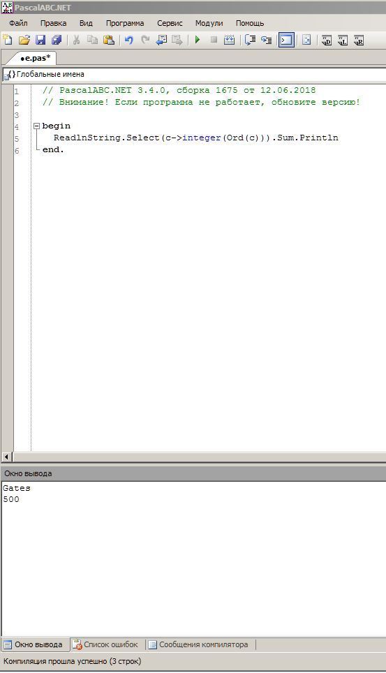 ReadlnString.Select(c->integer(Ord(c))).Sum.Println