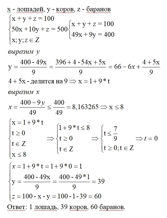 Извеняюсь за не удачный перевод. Логическая задача: У вас есть 500 тг. За эти деньги ровно далив эту сумму вы должны купить 100 голов. Лощадь стоит - 50 тг, корова-10 тг, баран 1 тге. ? Скажите пжл как решается такая задача ? Нашла ответ в интернете, но не смогла понять, так как не дошло до меня. Объясните пжл мне так, чтобы объяснить ребенку задачу. Заранее СПАСИБО.