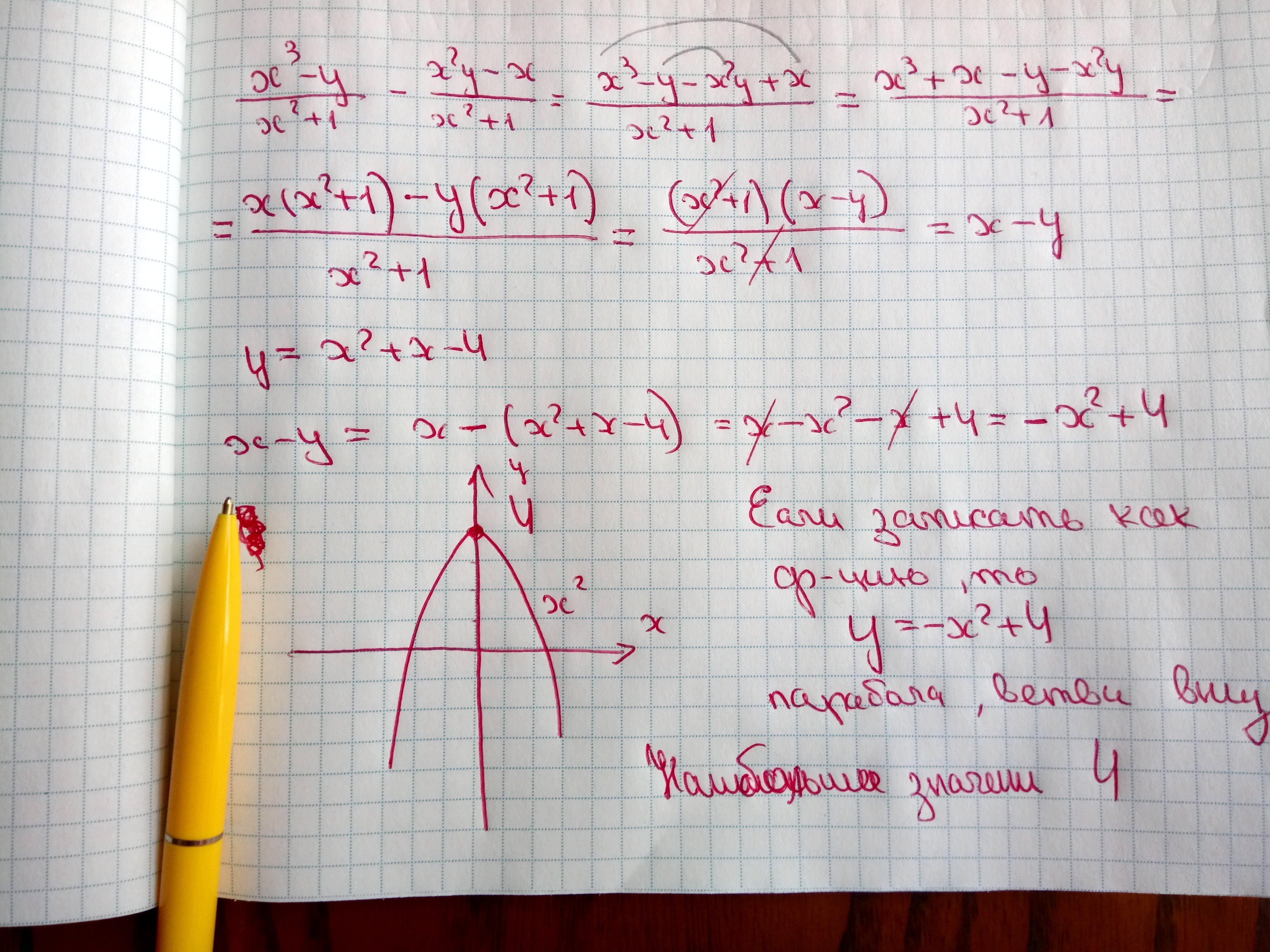 Как правило, выражение нужно сократить. А не подставив, сокращать. Сократив, мы получаем простое выражение х-у. Согласитесь, что в него удобнее подставить у=х^2+х-4, чем в дроби. Решение задания приложено.