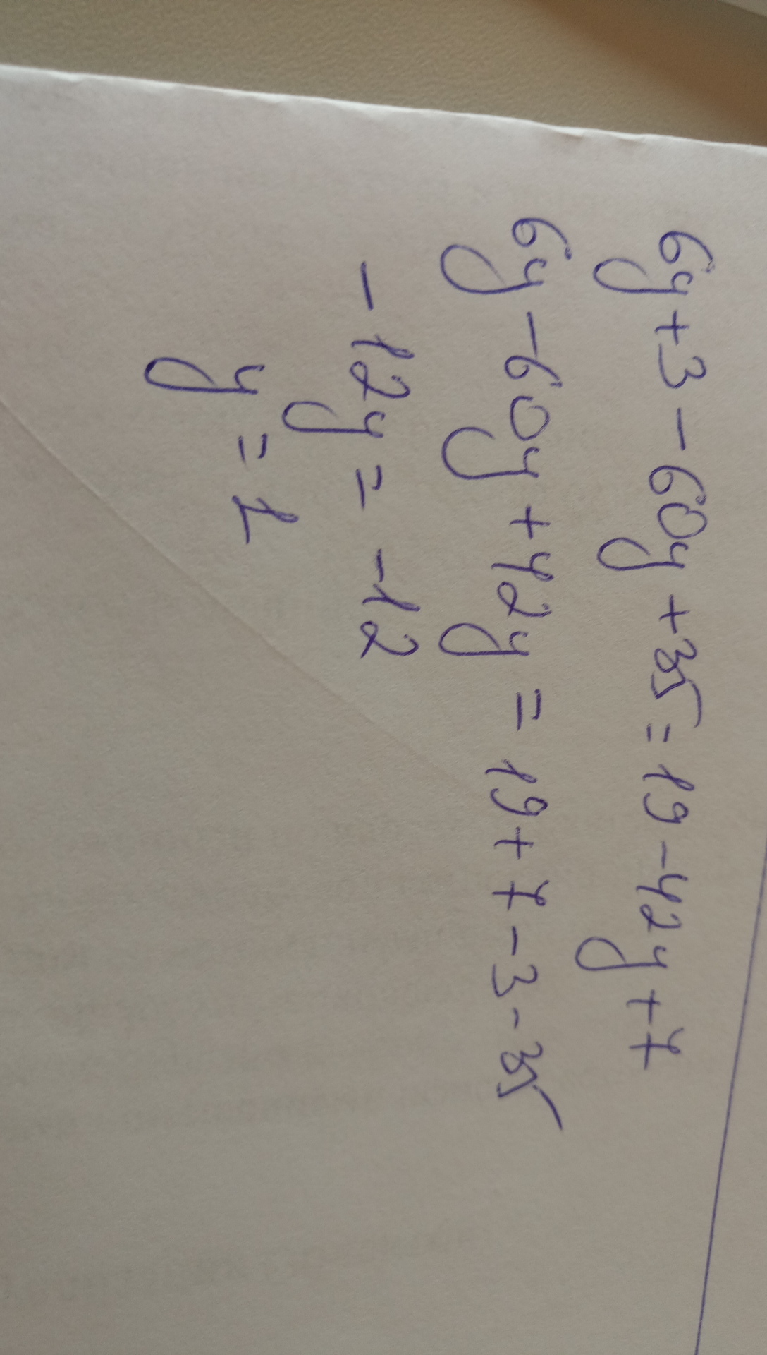 3(2y+1)-5(12y-7)=19-7(6y-1)