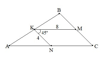 Средние линии KM и KN остроугольного треугольника ABC равны соответственно 8 см и 4 см и образуют между собой угол МКN, равный 45 градусов. Найдите площадь треугольника ABC.