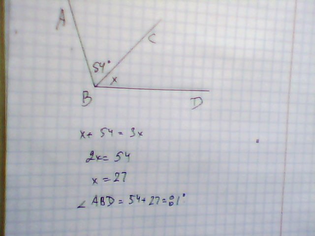 Луч BC проходит внутри угла АВD. Найдите угол ABD, если угол ABC 54, а угол CBD в три раза меньше угла ABC