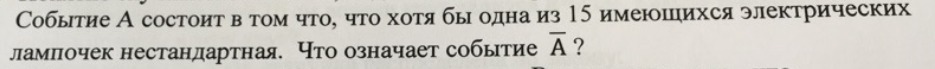 Событие А состоит в том, что хотя бы одна из 15 имеющихся электрических лампочек нестандартная. Что означает событие -А?