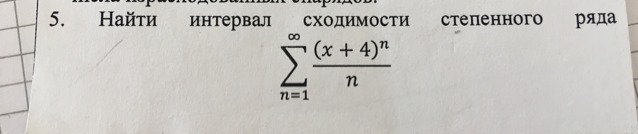 sumlimits _{n=1}^{infty }, frac{(x+4)^{n}}{n}\\limlimits _{n to infty}frac{|u_{n+1}|}{|u_{n}|}=limlimits _{n to infty}frac{|x+4|^{n+1}}{n+1} cdot frac{n}{|x+4|^{n}}=|x+4| textless  1\\-1 textless  x+4 textless  1\\-5 textless  x textless  -3\\x=-3:; ; sum limits _{n=1}^{infty }frac{1}{n}; -; ; garmonicheskij; rasxodyashijsya\\x=-5:; ; sum limits _{n=1}^{infty } frac{(-1)^{n}}{n}; -; ; yslovno; sxodyashijsya\\xin [-5;-3, )