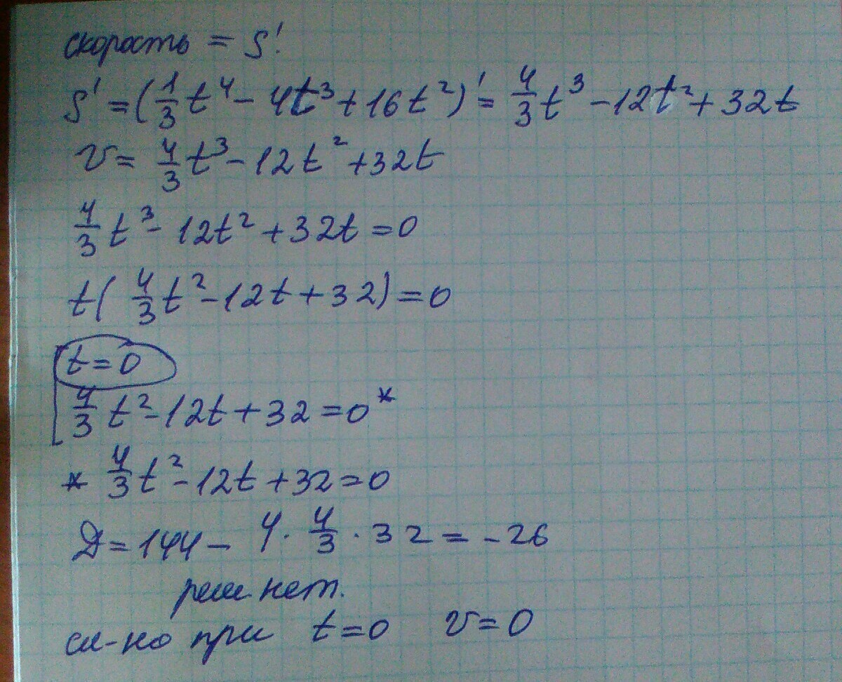 Тело движется прямолинейно по закону s=1/3t^4-4x^3+16t^2. В какой момент времени скорость тела будет равна 0?
