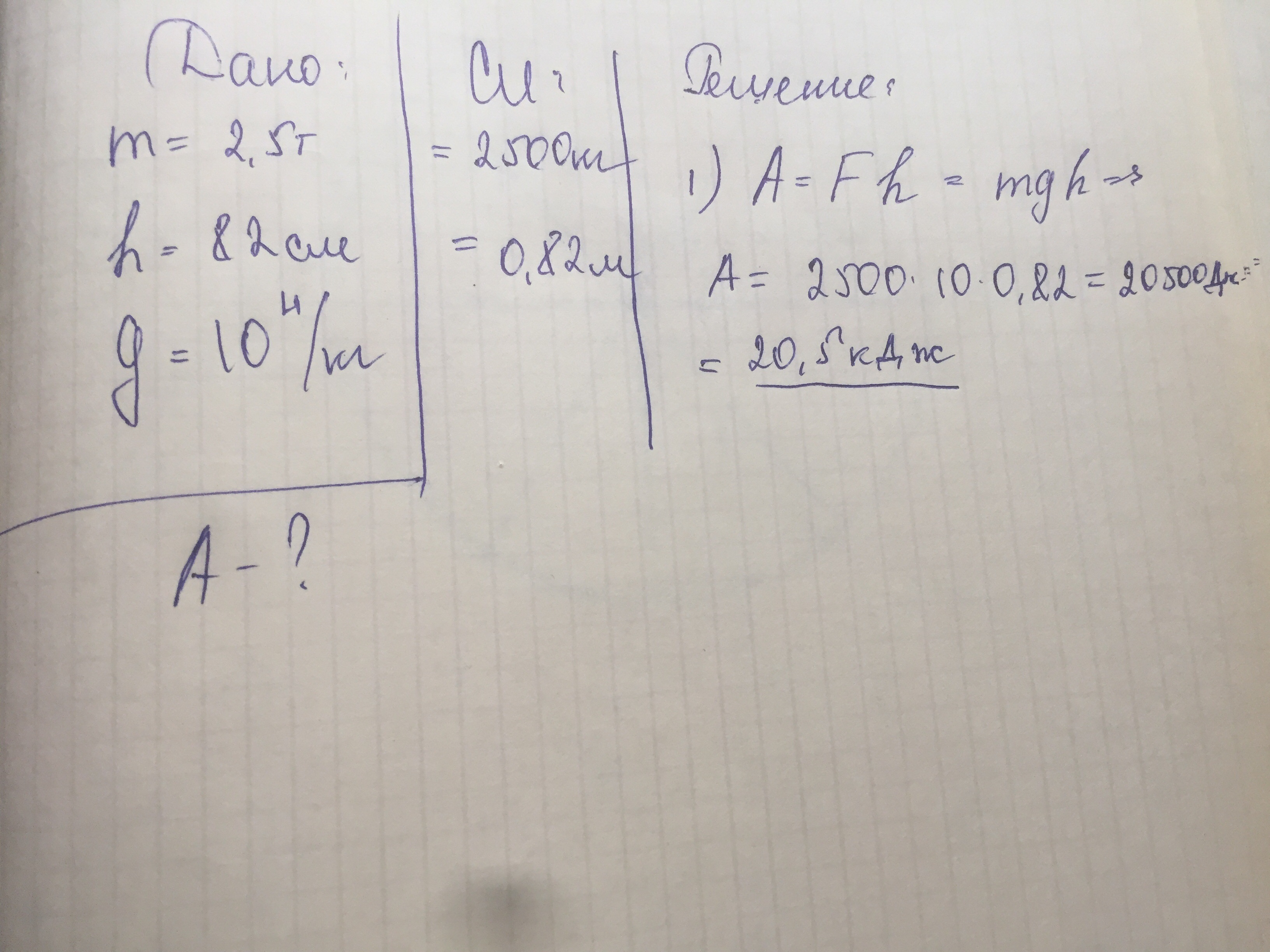 автокран поднимает груз 2,5 тонн на высоту 82 см. вычислить произведенную работу. ПОМОГИТЕ ПОЖАЛУЙСТА