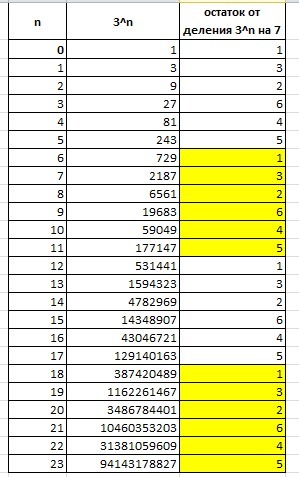 если 3 возводить в степень показатель которой целое число начиная с 0 и делить на 7, то можно заметить, что остатки от деления на 7 будут равны 1;3;2;6;4:5 и далее эта последовательность остатков будет бесконечно повторяться. см. картинку. то что это будет повторяться до бесконечности строго говоря надо доказать, но пока что предположим что так и есть. если что то можно над этим тоже подумать, например доказать методом мат индукции.