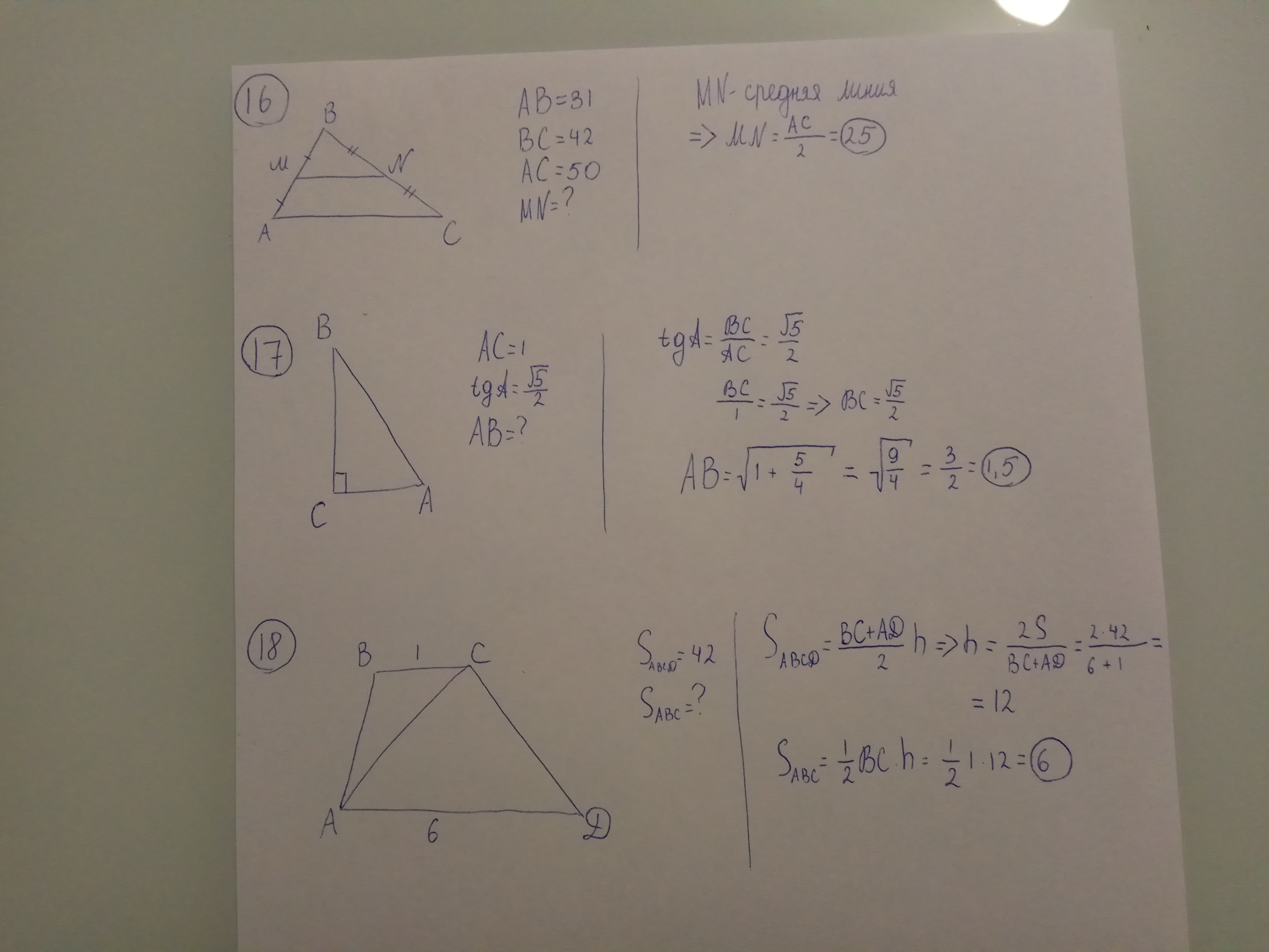 2)tgA=BC/AC; BC=AC*tgA; BC=√5/2; AB=√BC²+AC²=5/4+1=√2,25=1,5