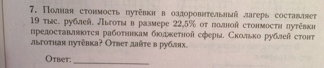 скидка 22,5% то стоимость путевки будет составлять 100%-22,5%=77,5% о 19000 рублей, что равно 19000•77,5/ 100= 19000•77,5/100= 19000•0,775=14725 рублей